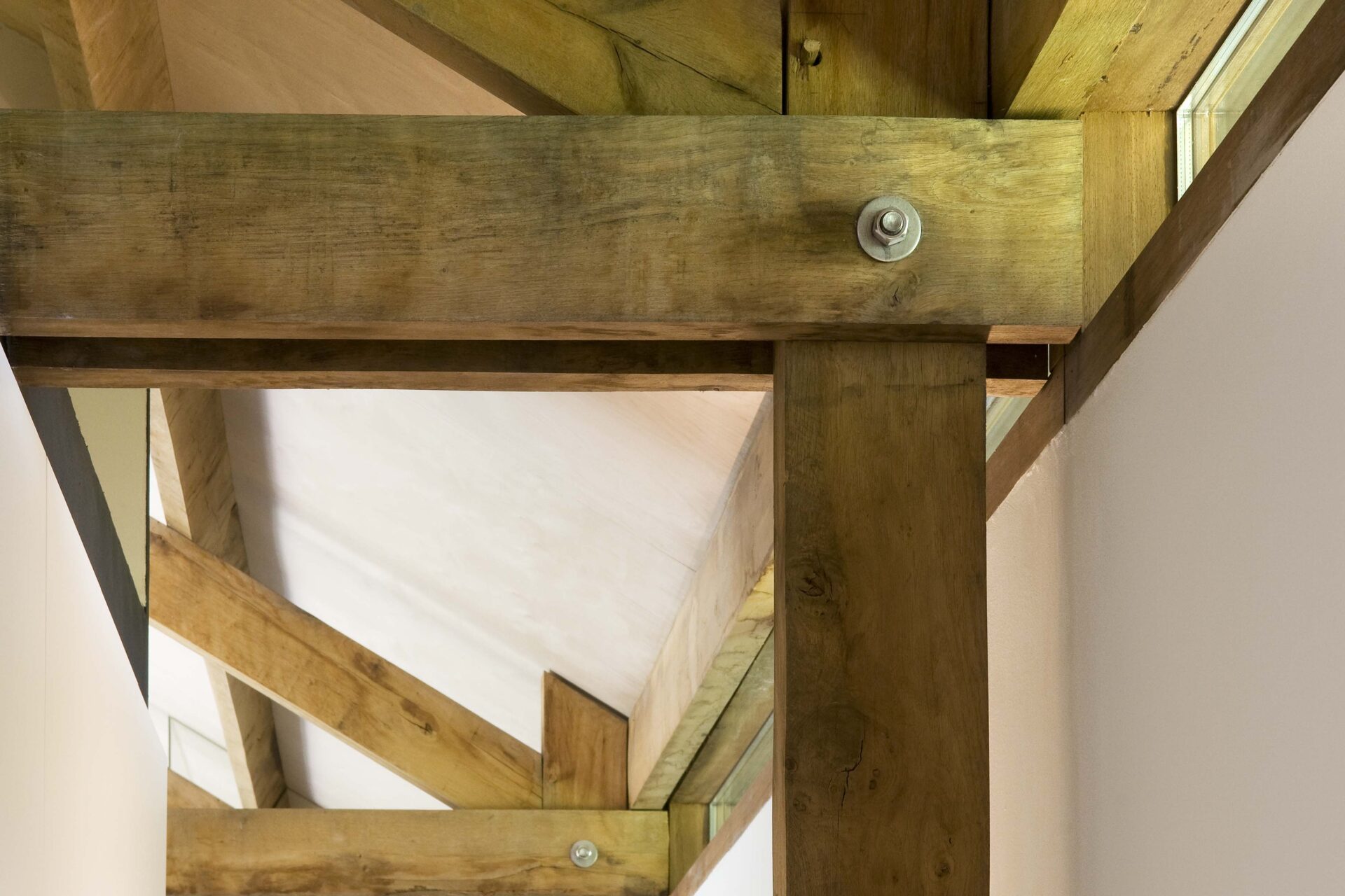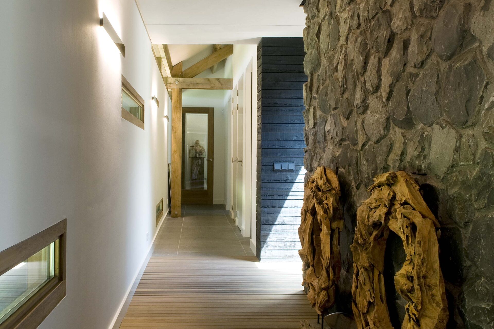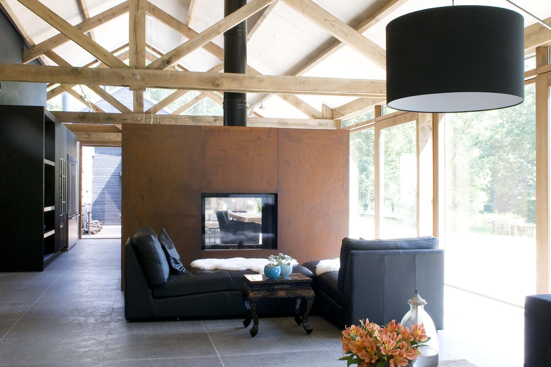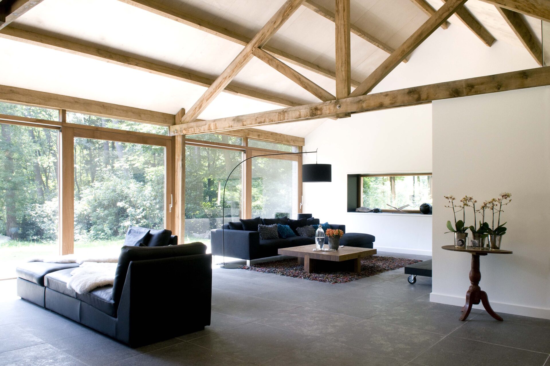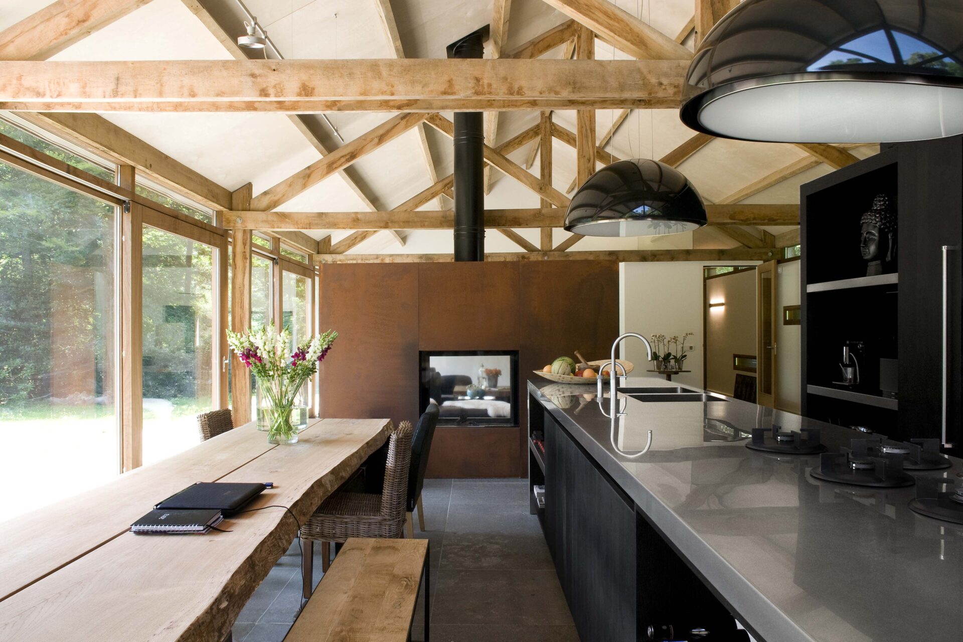 Midden in de woning, tussen de keuken en de private slaapkamers, ligt de overdekte veranda, het hart van de lange woning. De bewoners kunnen hierdoor nog meer tijd spenderen in de buitenlucht, blootgesteld aan de natuur en omringd door natuurlijke materialen. De robuuste, natuurlijk materialen in de buitenruimte – de houten vloer, de ruwe stenen muur en de zichtbare constructie van eikenhouten spanten – sluiten hierop aan. Die sfeer zet zich binnen in de woning door, waar de mee-ontworpen meubels en interieur – de Spaanse hardstenen vloer, de ingetogen donkergrijze keuken, de grootte, robuuste houten eettafel en de cortenstaal openhaard – deel uit maken van het totaalconcept. Aan de buitenzijde van de woning dragen natuurlijke, deels onbehandelde materialen – donkere stenen gevel, de onbehandelde Iroko kozijnen en het zinken dak – bij aan de integratie van het huis in het landschap; zij zijn kenmerkend voor het pure, sobere karakter van het Boshuis.