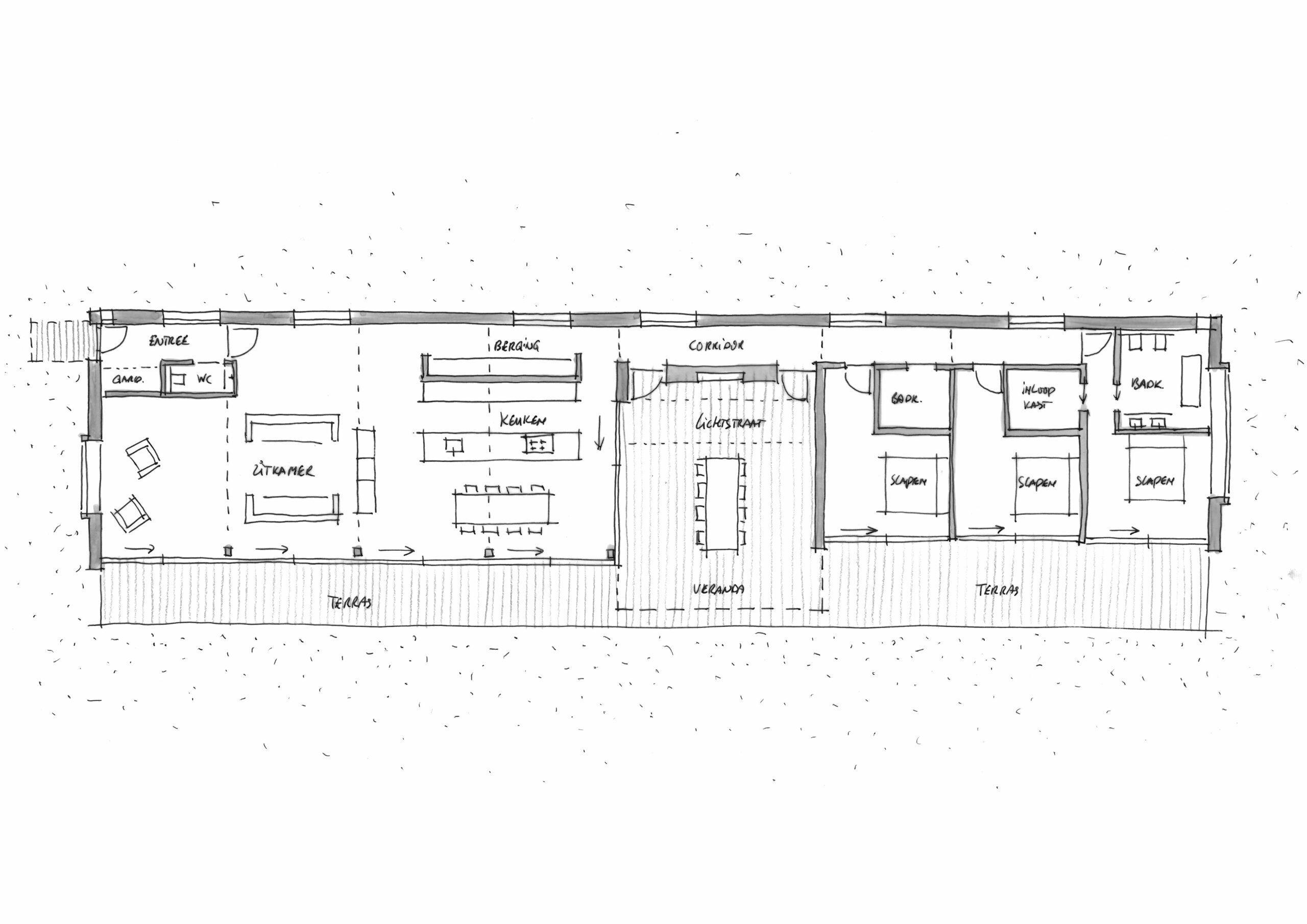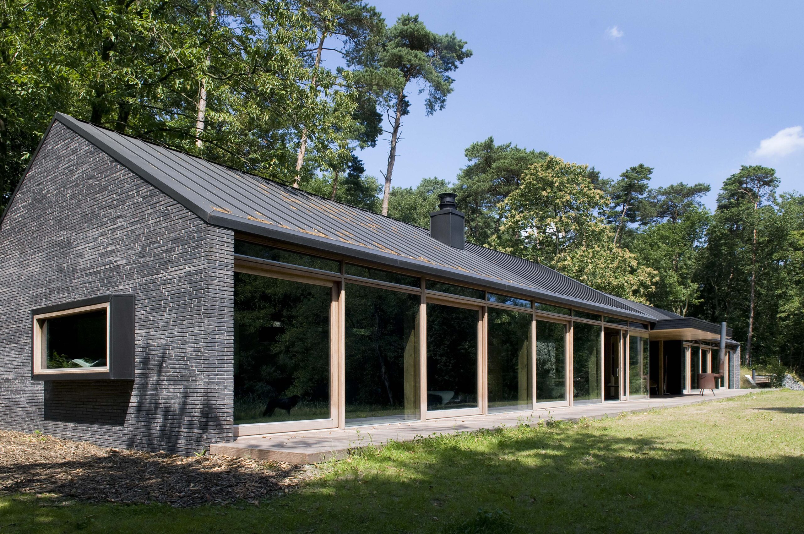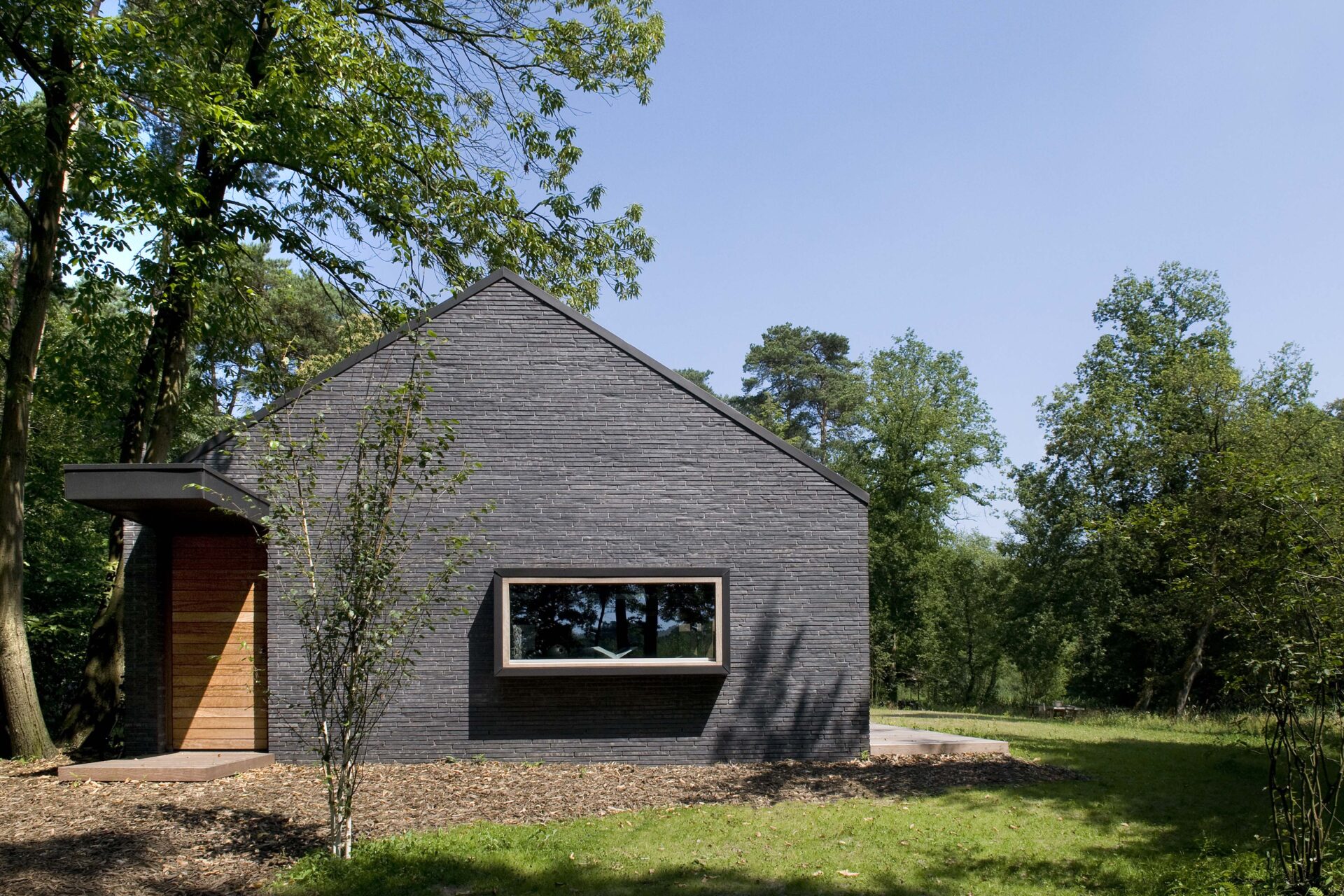 Om optimaal te kunnen genieten van het zicht op het ven liggen alle leefruimtes in het nieuwe huis in één rij naast elkaar, allen gericht op het ven. Hierdoor ontstaat een langgerekt volume, met aan één zijde een volledig open, glazen gevel met grote schuifpuien. Alle ruimtes zijn verbonden door een lange gang aan de achterzijde van de woning. In contrast met de open gevel aan het ven, grenst aan deze gang juist een gesloten gevel. De gevel is opgebouwd uit lange, zwarte bakstenen, die het lineaire karakter van de woning versterken. De harde, gesloten muur sluit deze zijde van het huis af van het naastliggende hotel. Contact is enkel mogelijk door een aantal kleine langgerekte speelse ramen.