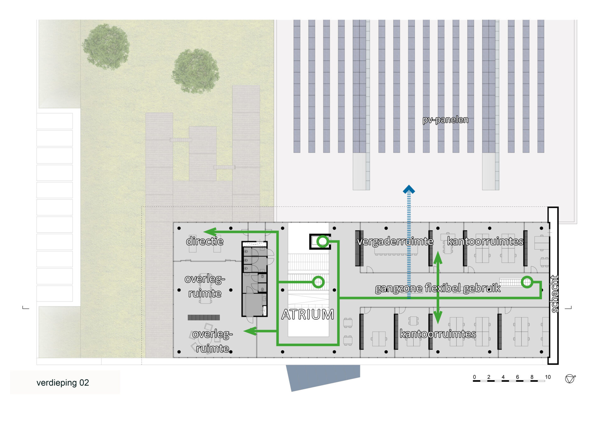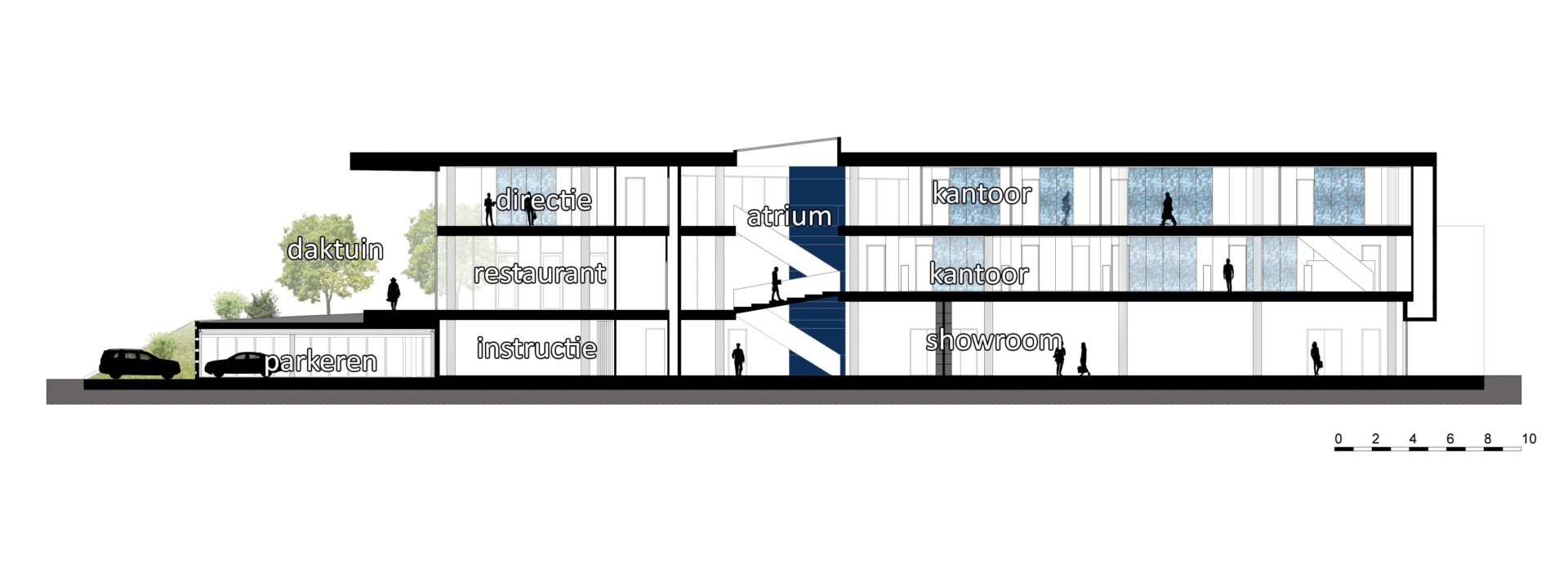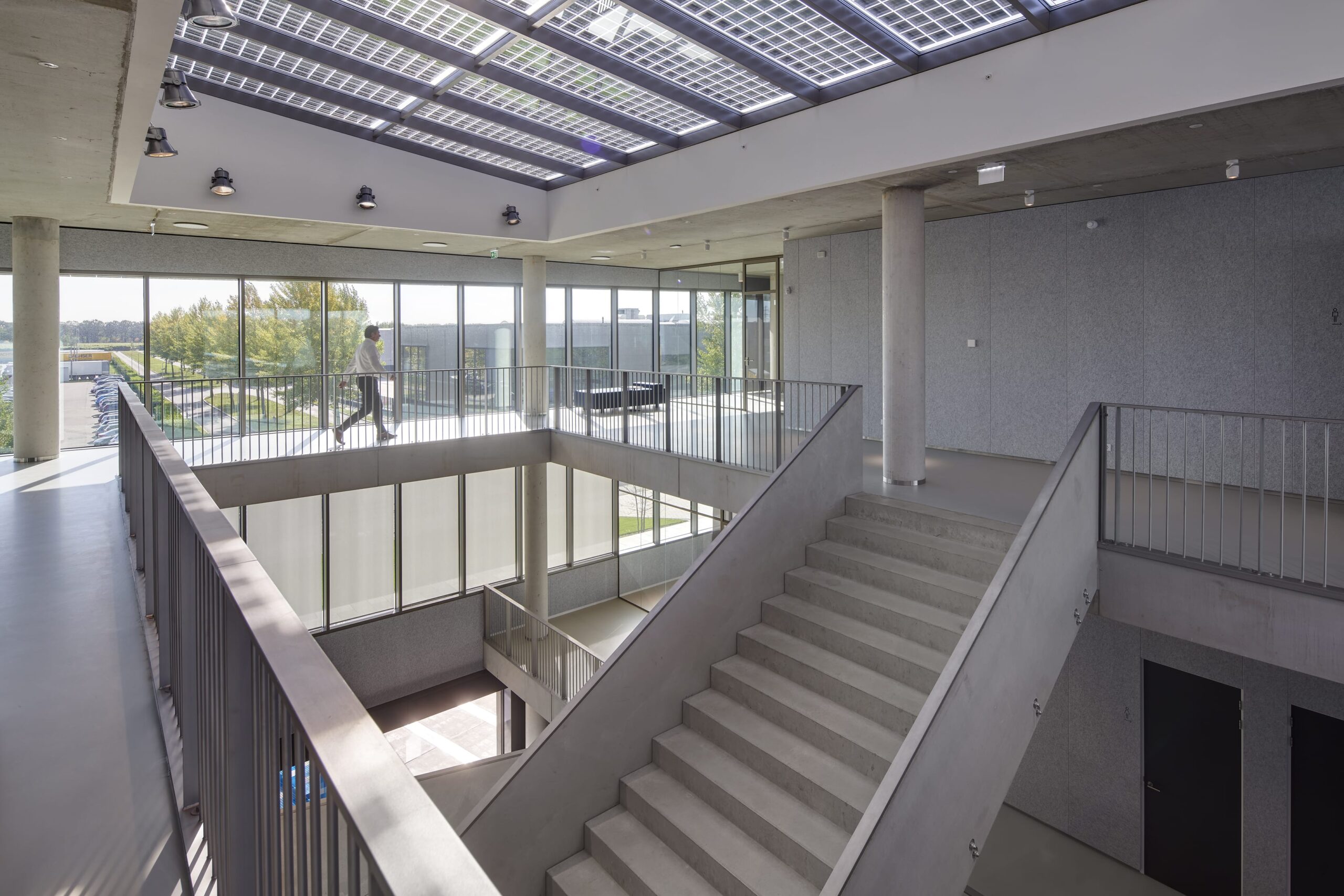 Het atrium speelt een centrale rol in het gebouw. Door licht, lucht en visuele verbinding draagt het bij aan het transparante karakter van de architectuur. De routing door het gebouw gaat altijd via het atrium, dat zo alle verdiepingen ook fysiek met elkaar verbindt.