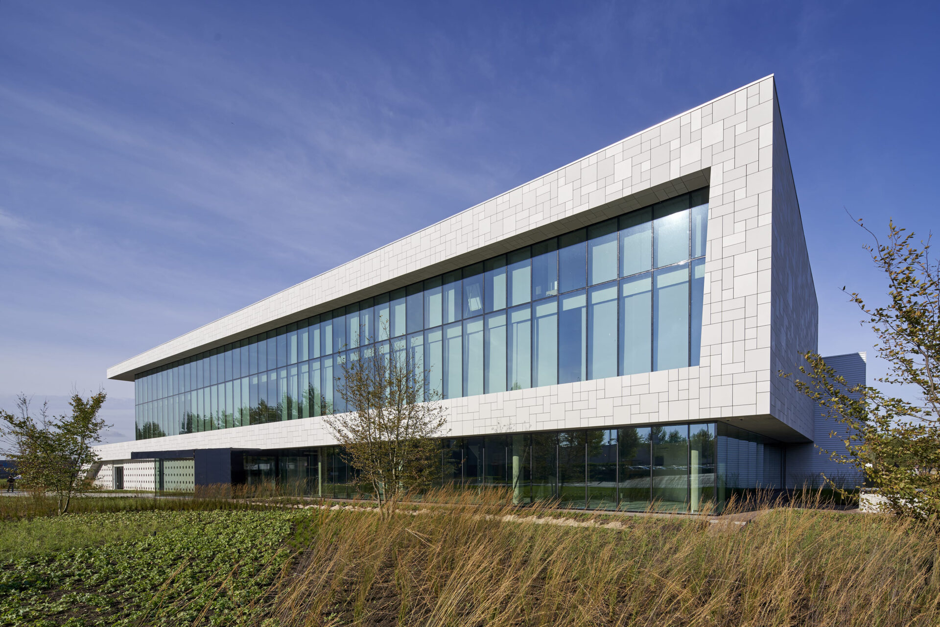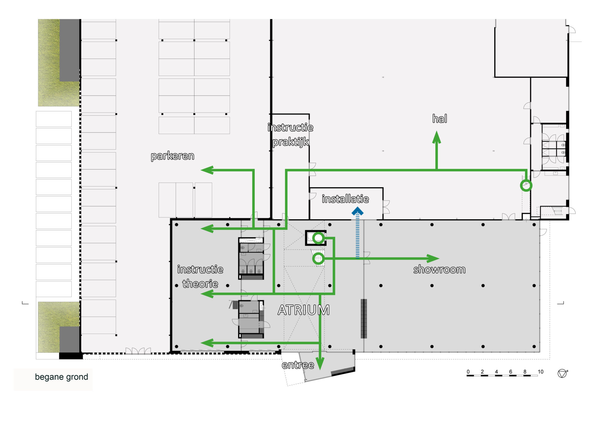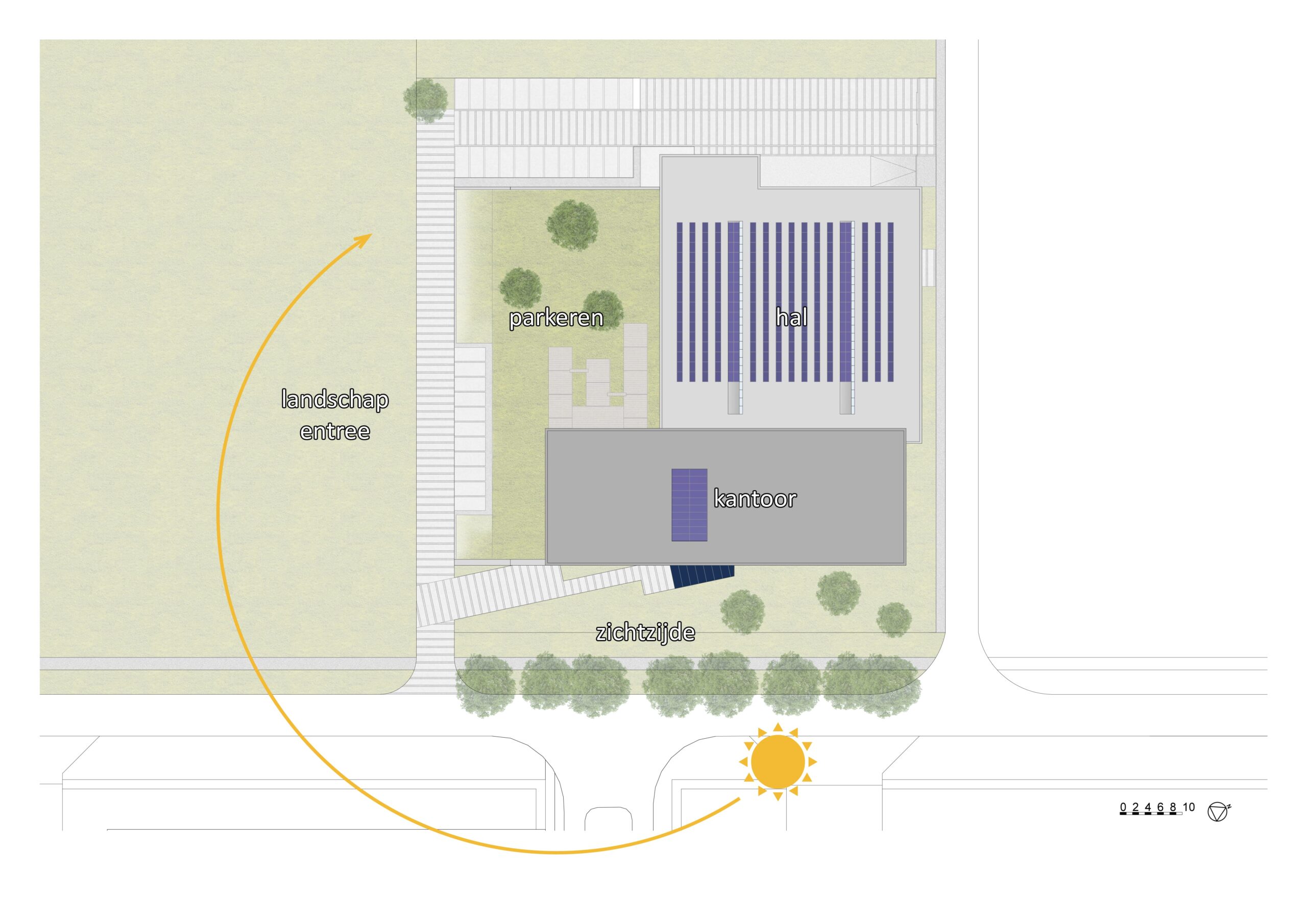 Met de juiste toepassingen wordt zowel het gebouw als de omgeving naar een hoger plan getild. Door het omhoog trekken van het landschap worden de parkeerplaatsen aan het zicht onttrokken, richten de glazen gevels van de kantoren zich naar het omringende landschap en wordt de showroom op de toegangsweg gericht.