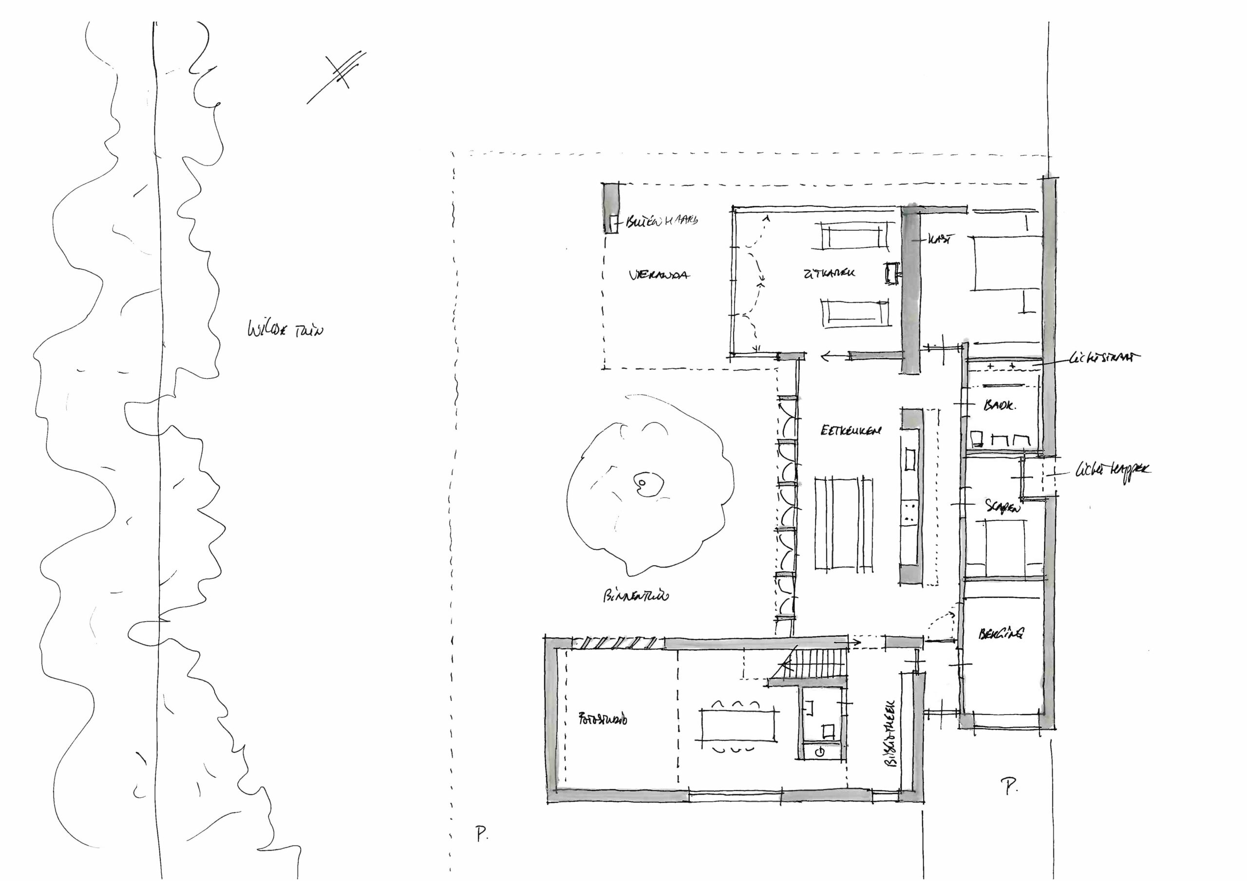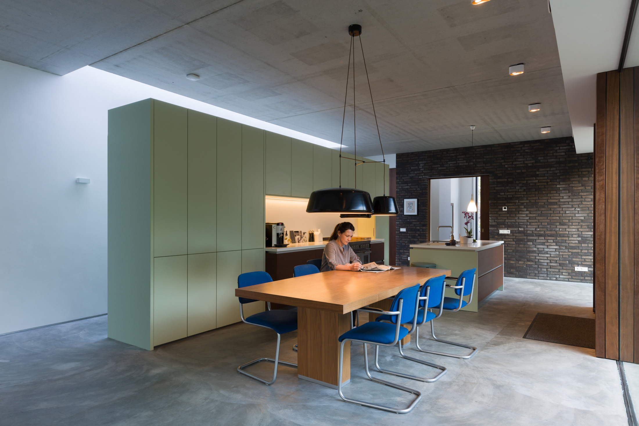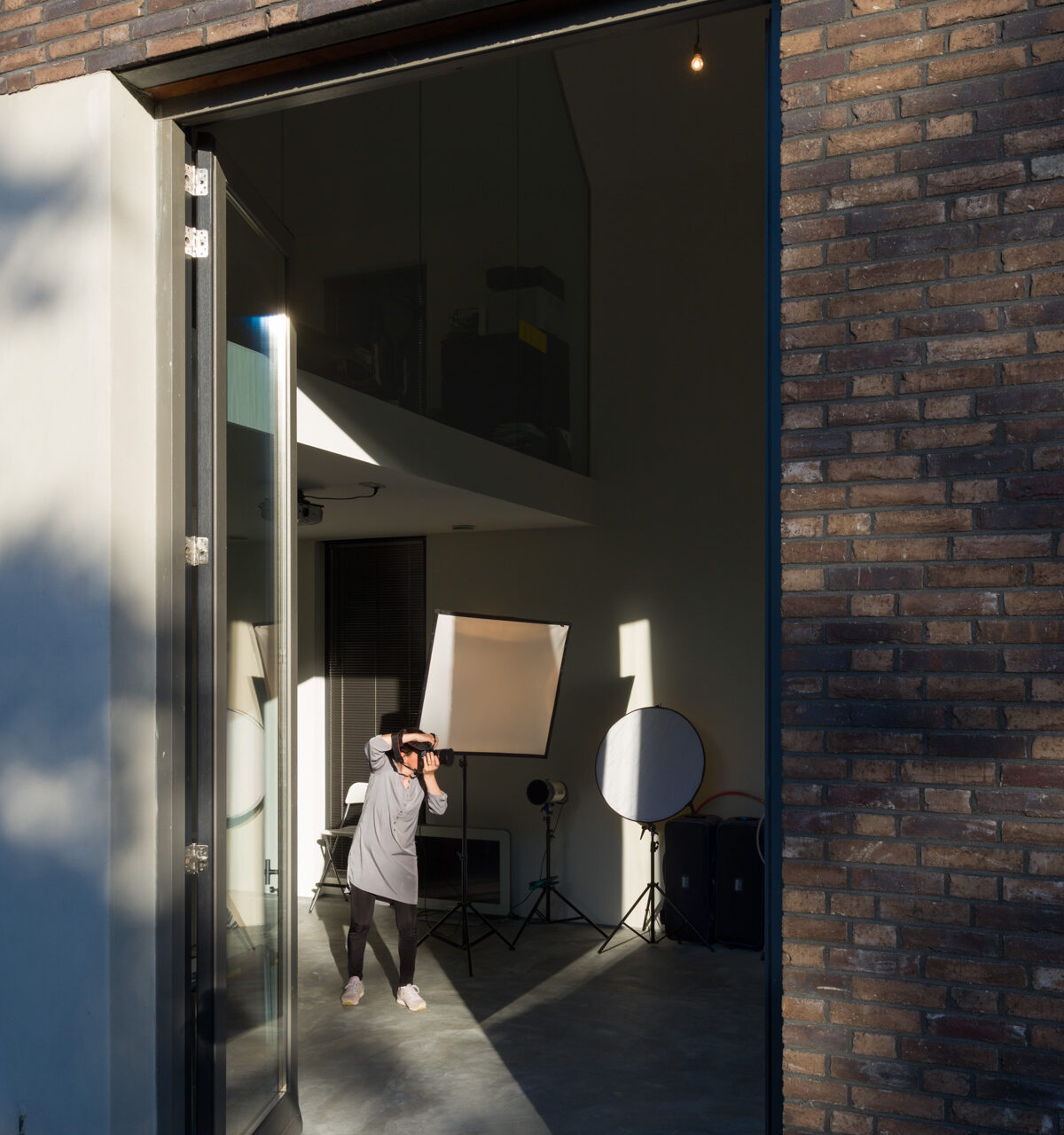Het was de wens van beide opdrachtgevers om aan huis te kunnen werken: voor hem een prettige, lichte computerwerkplek en voor haar een ruimtelijke, hoge fotostudio. De werkruimtes bevinden zich juist in het ‘archetype huis’-gedeelte van het WerkHuis en zijn subtiel van elkaar gescheiden door een translucente wand.