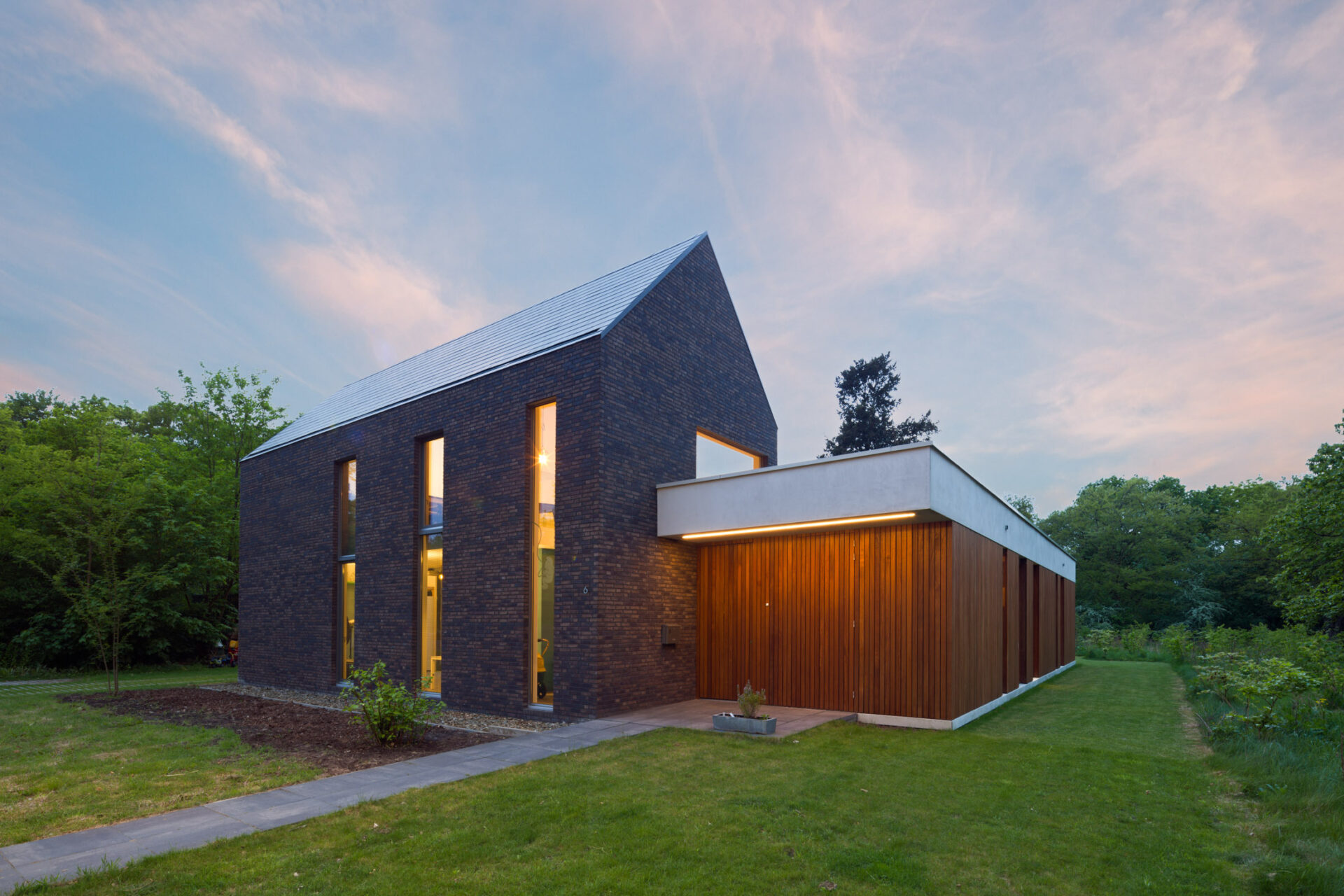 De materialen – baksteen, hout, beton en glas – geven het WerkHuis een robuust en eenduidig karakter. De glazen pui zorgt voor veel daglicht en zicht op het omringende landschap, terwijl de omarmende vormgeving van het WerkHuis de privacy waarborgt en een gevoel van geborgenheid geeft.